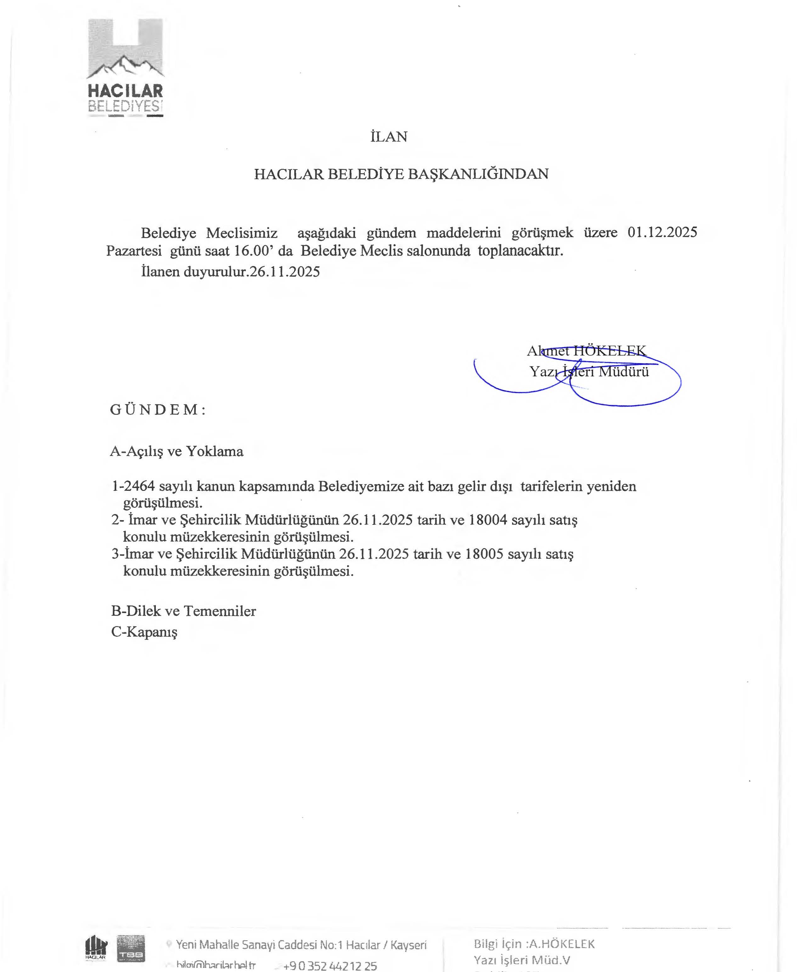 HACILAR BELEDİYE MECLİSİ ARALIK AYI GÜNDEM DUYURUSU