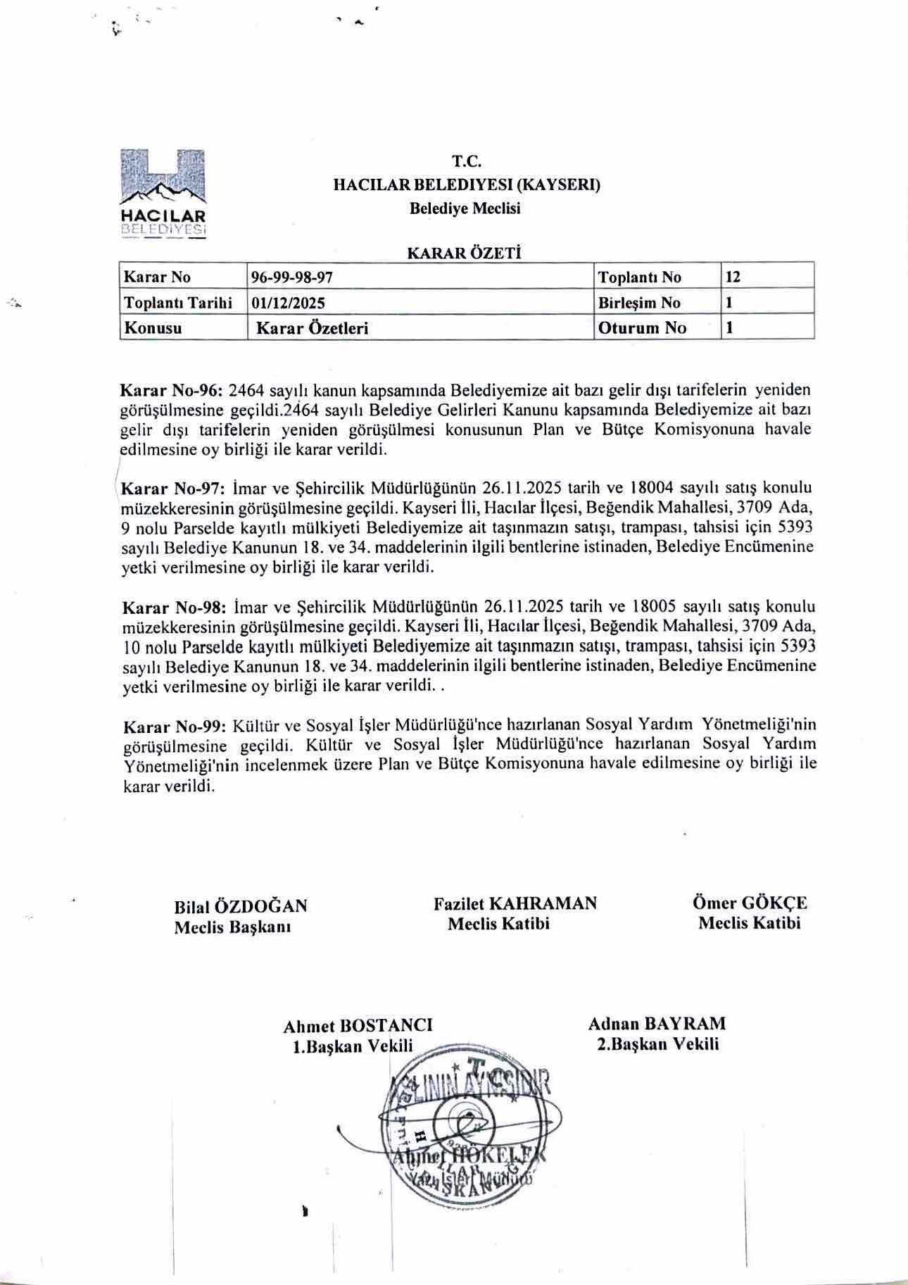 HACILAR BELEDİYE MECLİSİ ARALIK AYI KARAR ÖZETİ