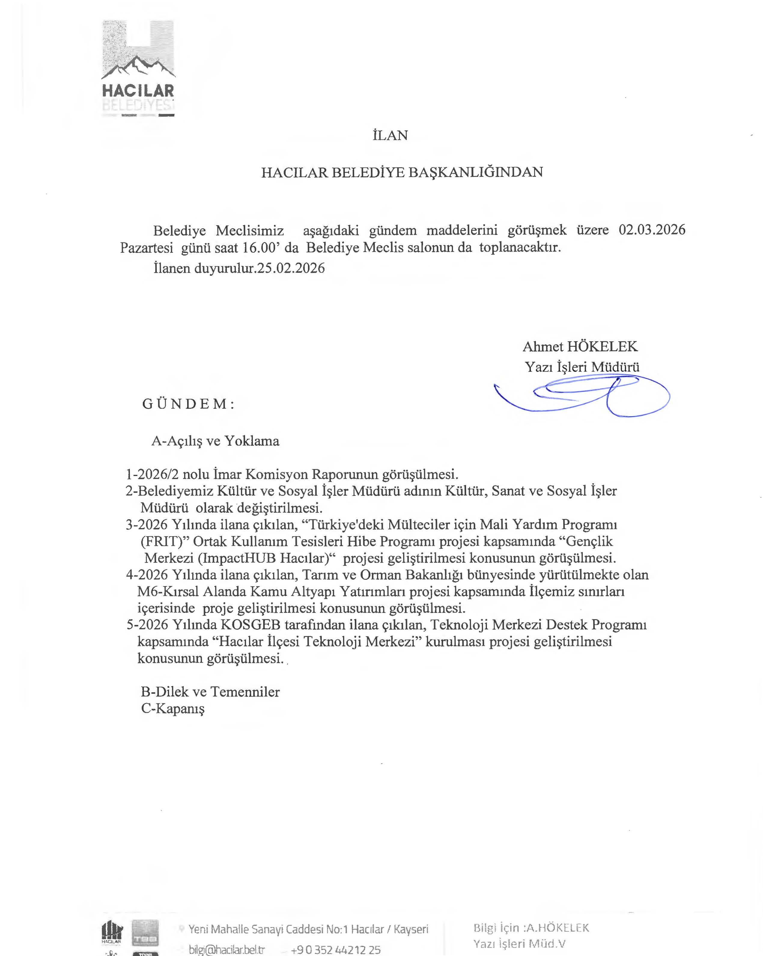 HACILAR BELEDİYE MECLİSİ MART AYI GÜNDEM DUYURUSU