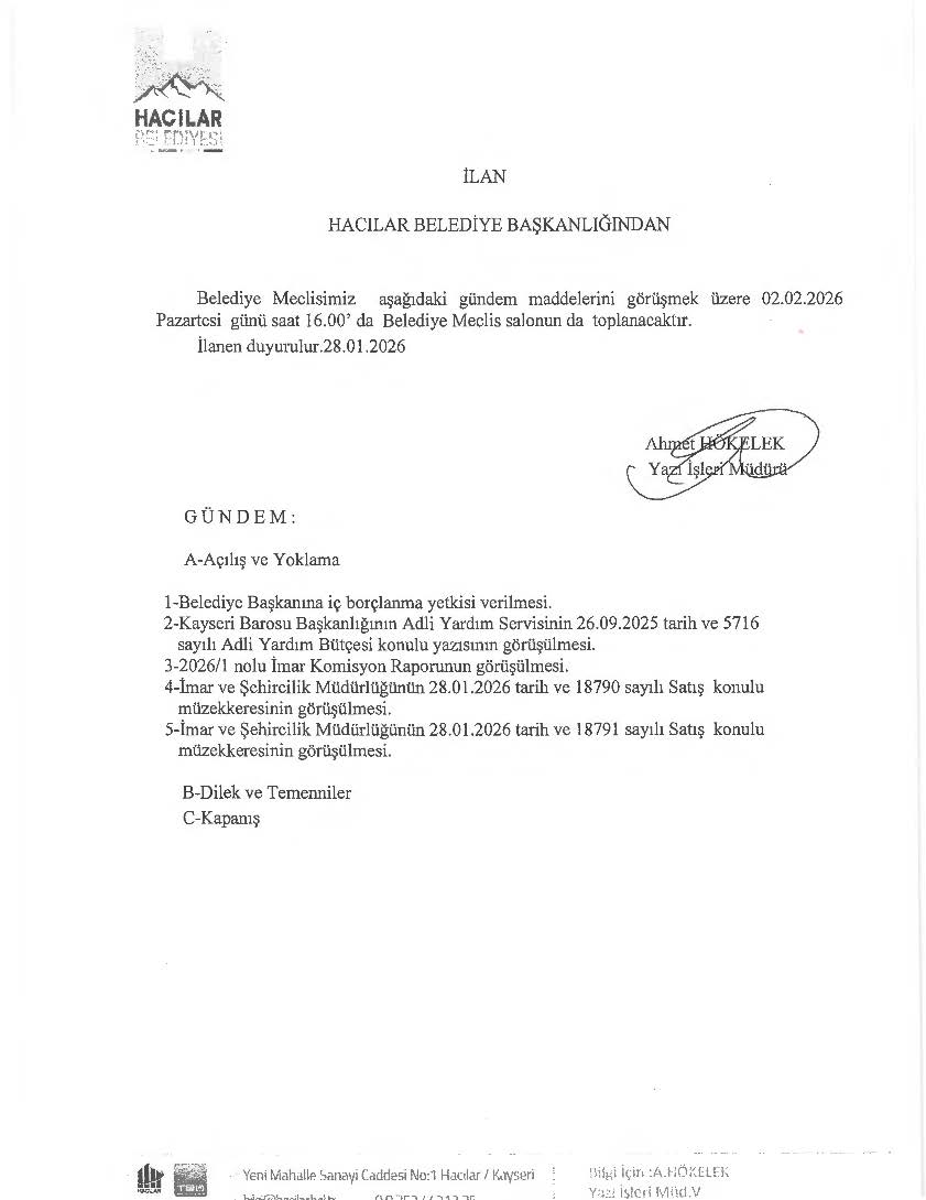 HACILAR BELEDİYE MECLİSİ ŞUBAT AYI GÜNDEM DUYURUSU