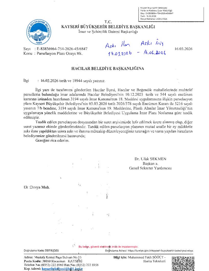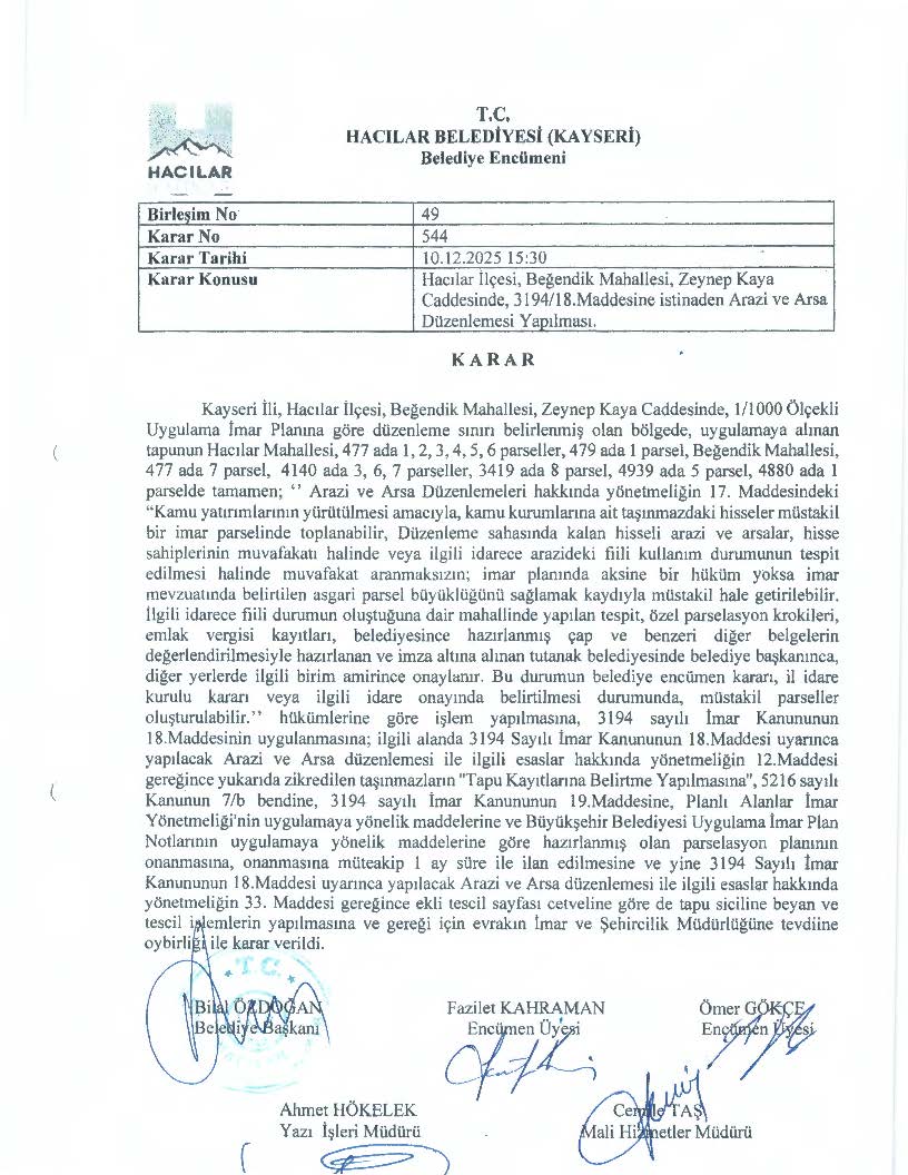 İlçemiz Beğendik Mahallesi Zeynep Kaya Caddesi'nde 3194 sayılı İmar Kanununun 18.madde uygulaması yapılması hakkında duyuru