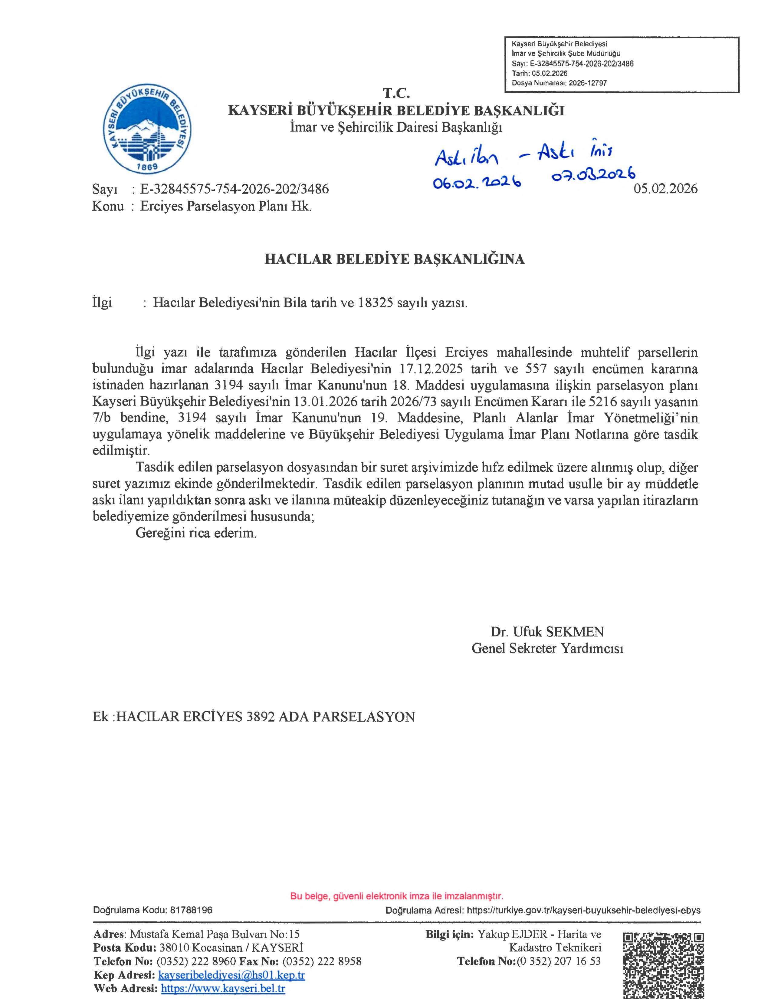 İLÇEMİZ ERCİYES MAH. 3194/18. MADDE UYGULAMASI YAPILMASI HAKKINDA DUYURU