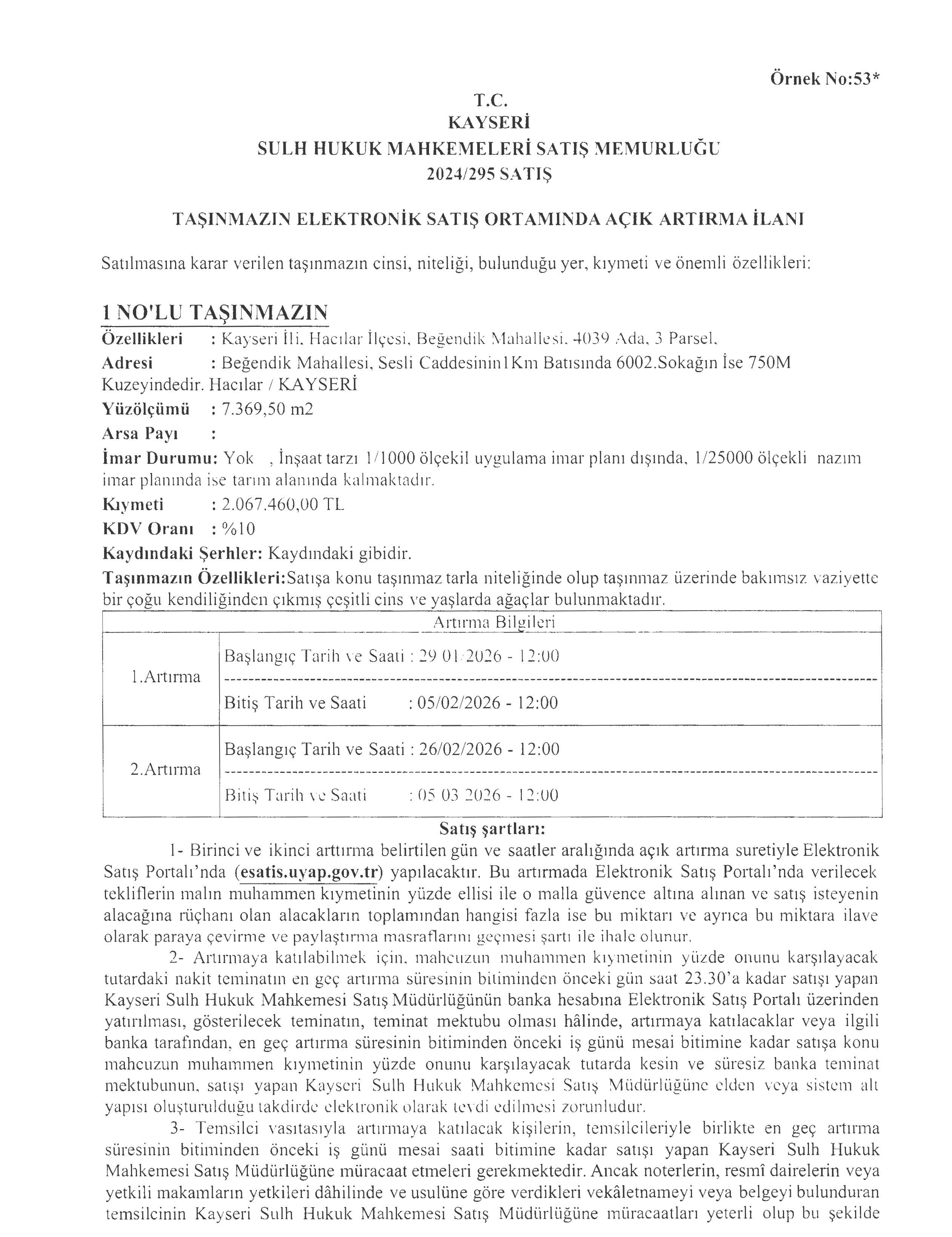 TAŞINMAZIN ELEKTRONİK SATIŞ ORTAMINDA AÇIK ARTIRMA İLANI 05.03.2026