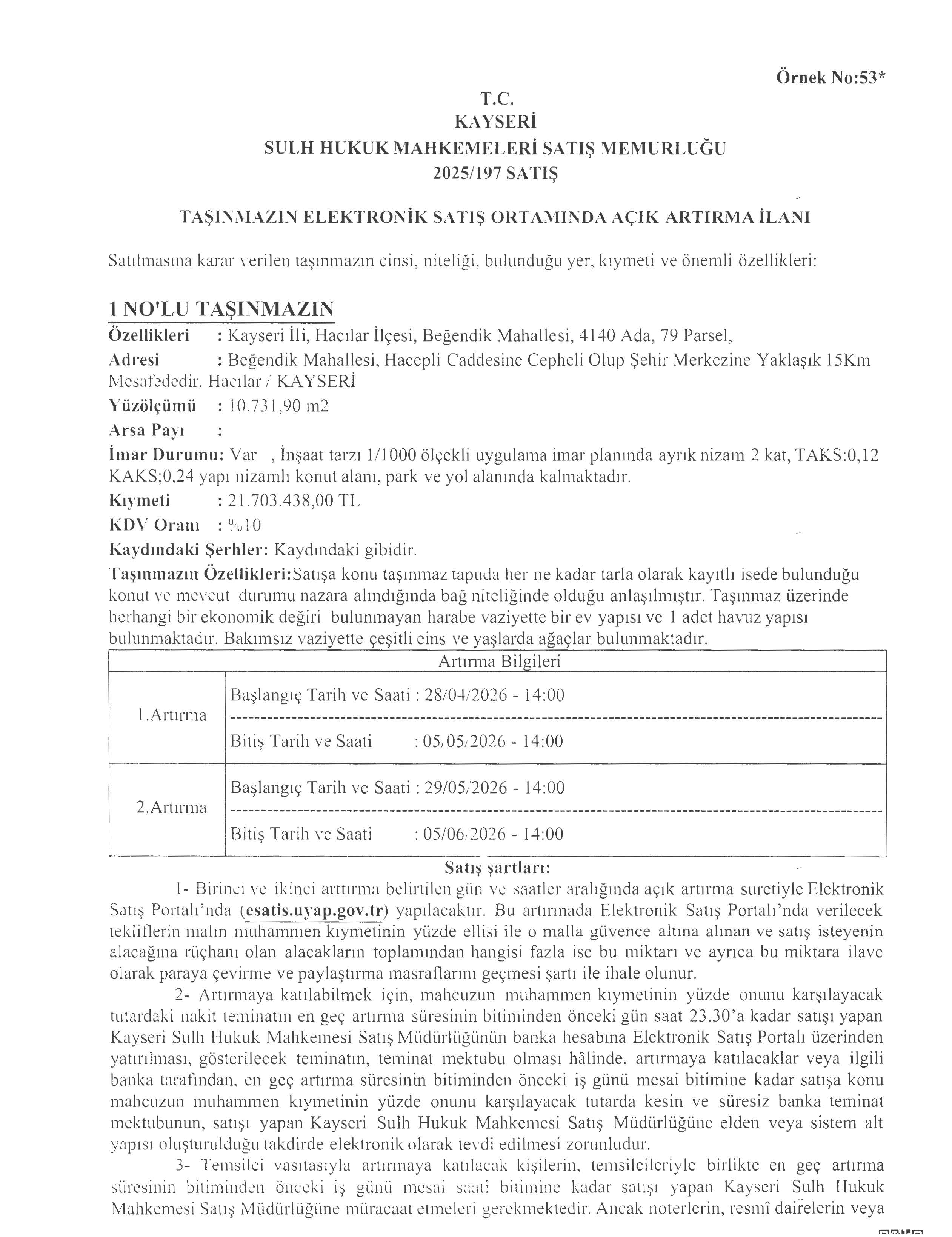 TAŞINMAZIN ELEKTRONİK SATIŞ ORTAMINDA AÇIK ARTIRMA İLANI 05.06.2026