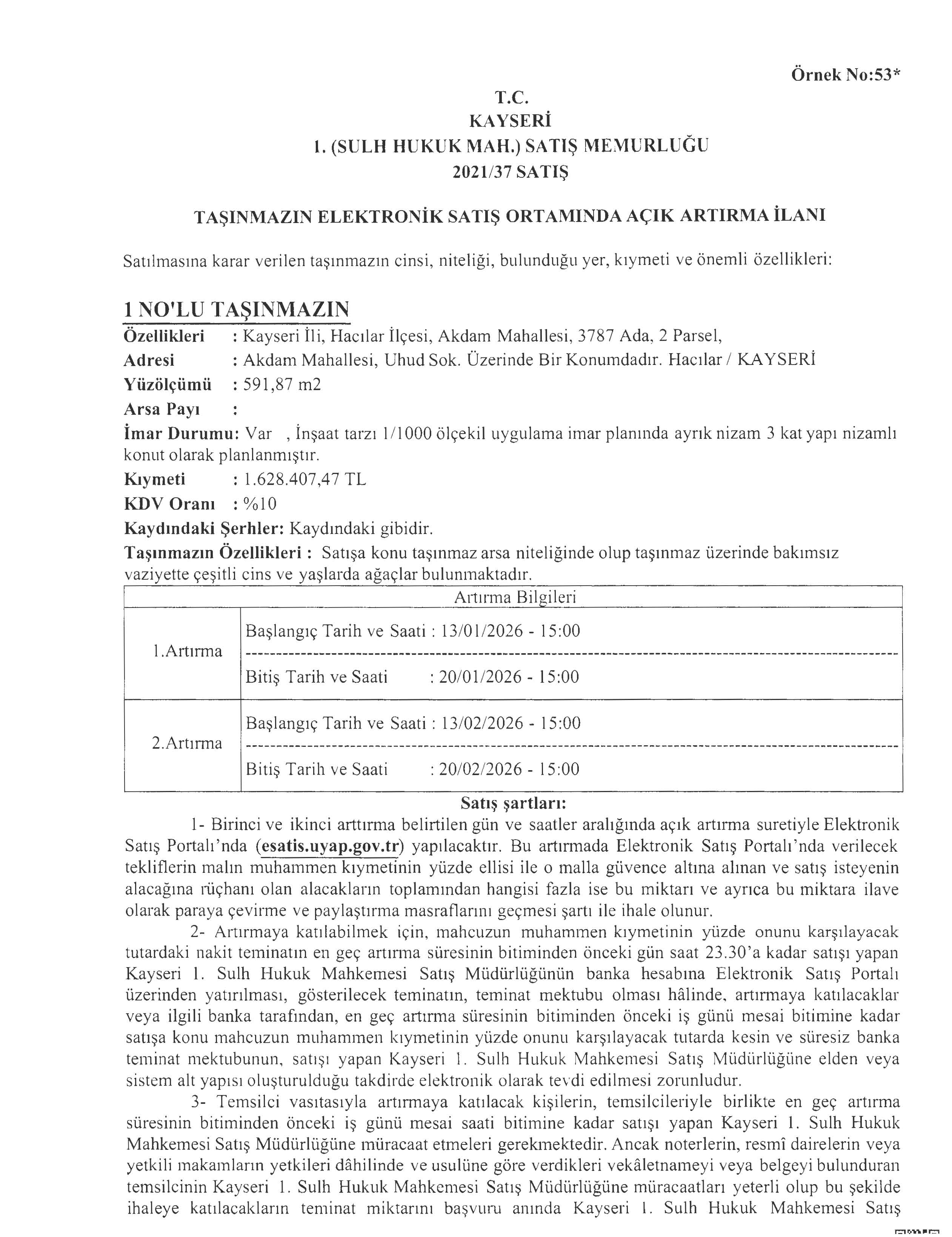 TAŞINMAZIN ELEKTRONİK SATIŞ ORTAMINDA AÇIK ARTIRMA İLANI 20.02.2026