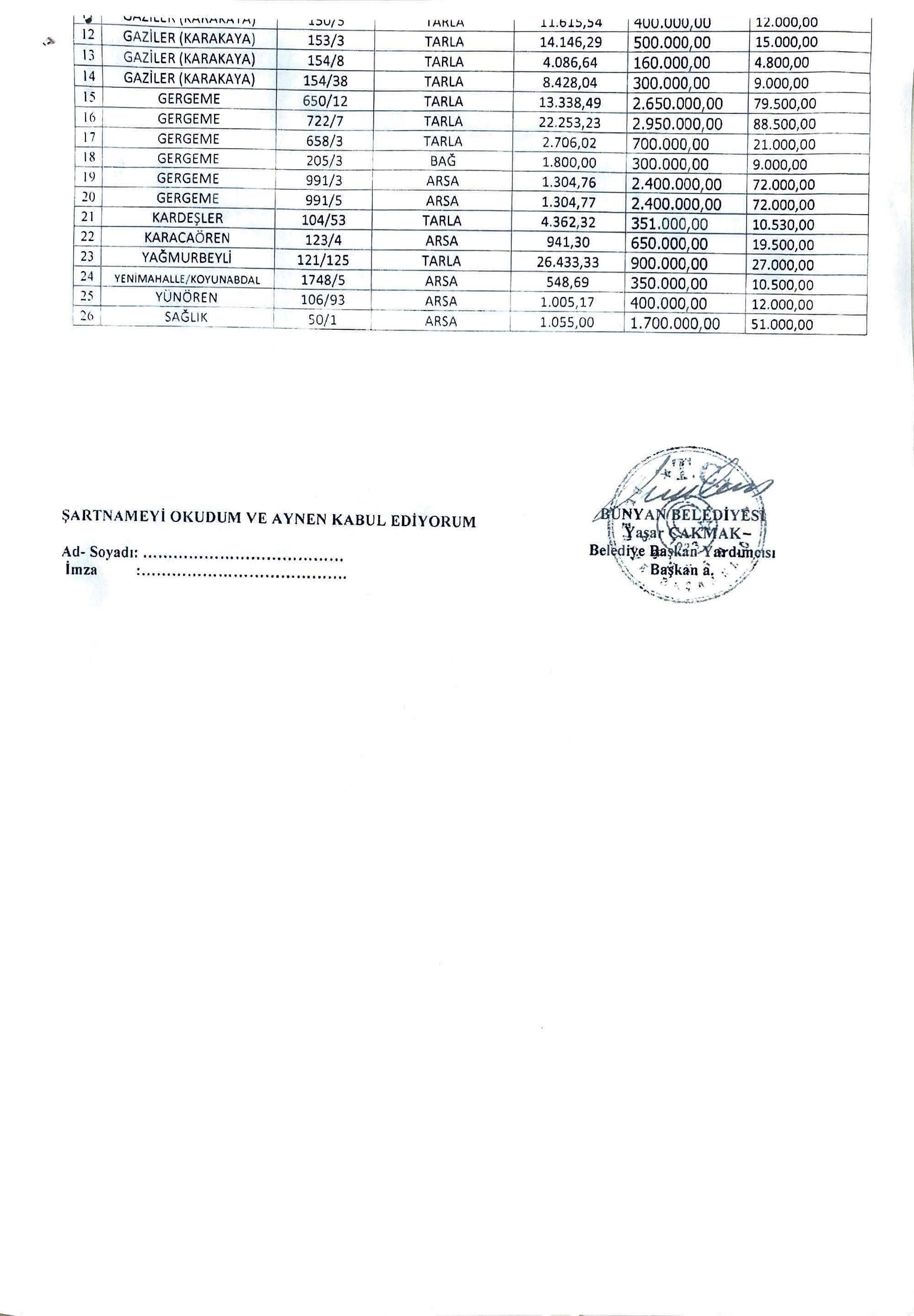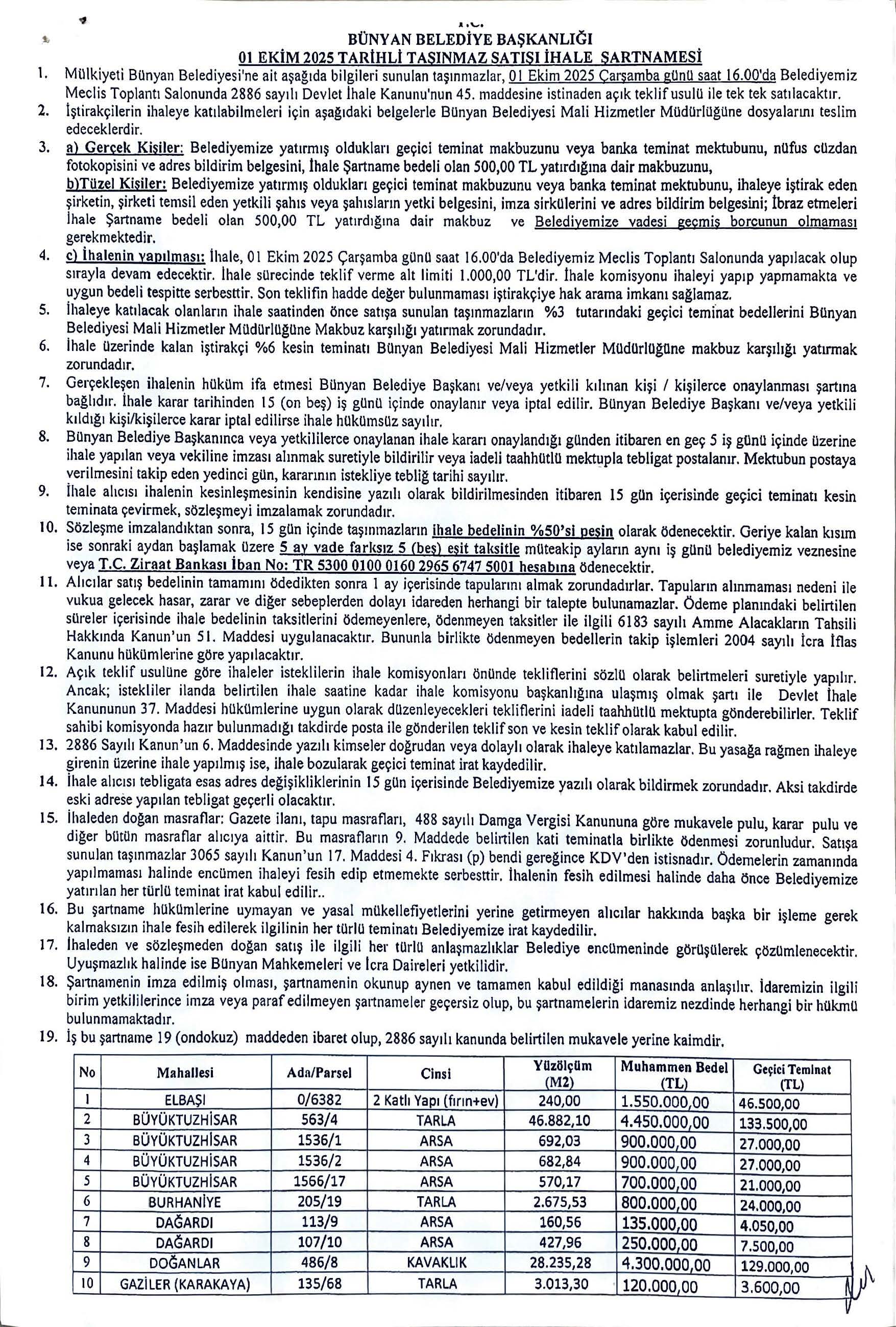 BÜNYAN BELEDİYESİ TAŞINMAZ SATIŞ İHALESİ DUYURUSU 1.10.2025