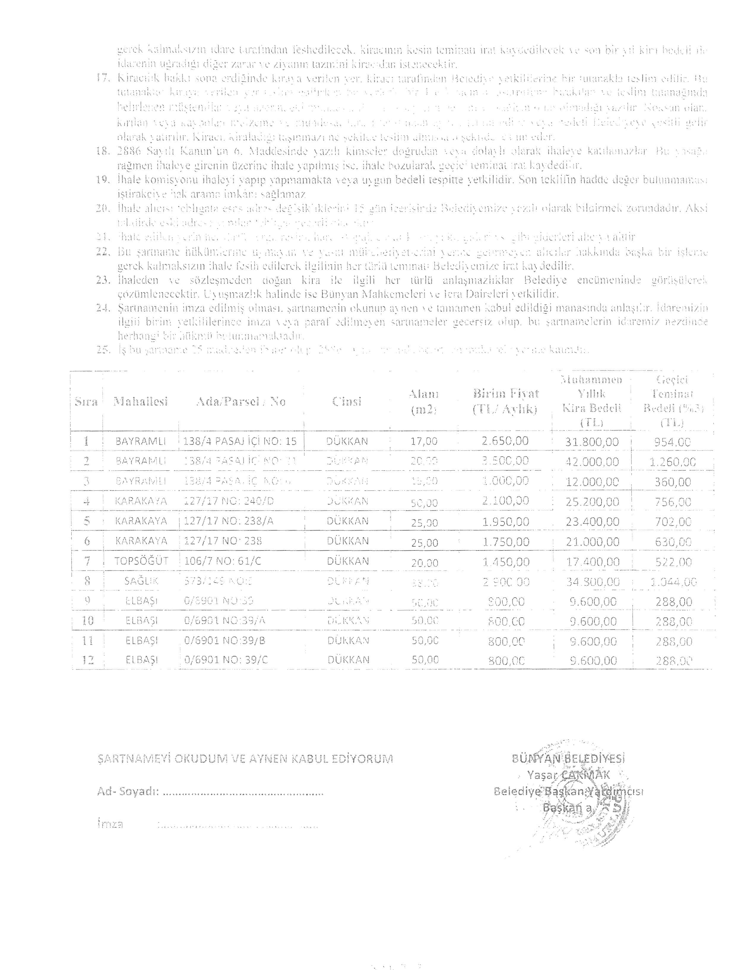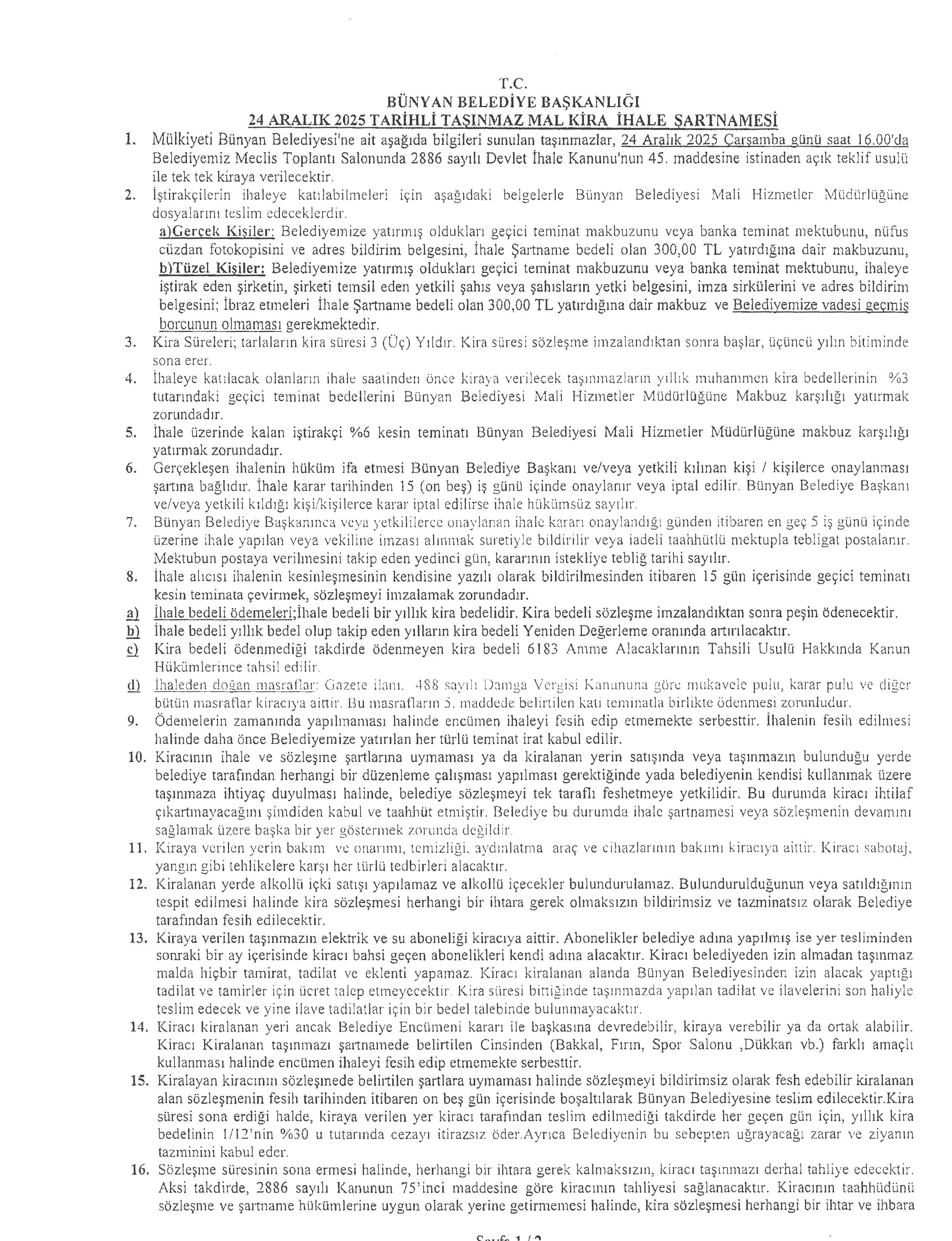 BÜNYAN BELEDİYESİ TAŞINMAZ SATIŞ İHALESİ DUYURUSU 24.12.2025