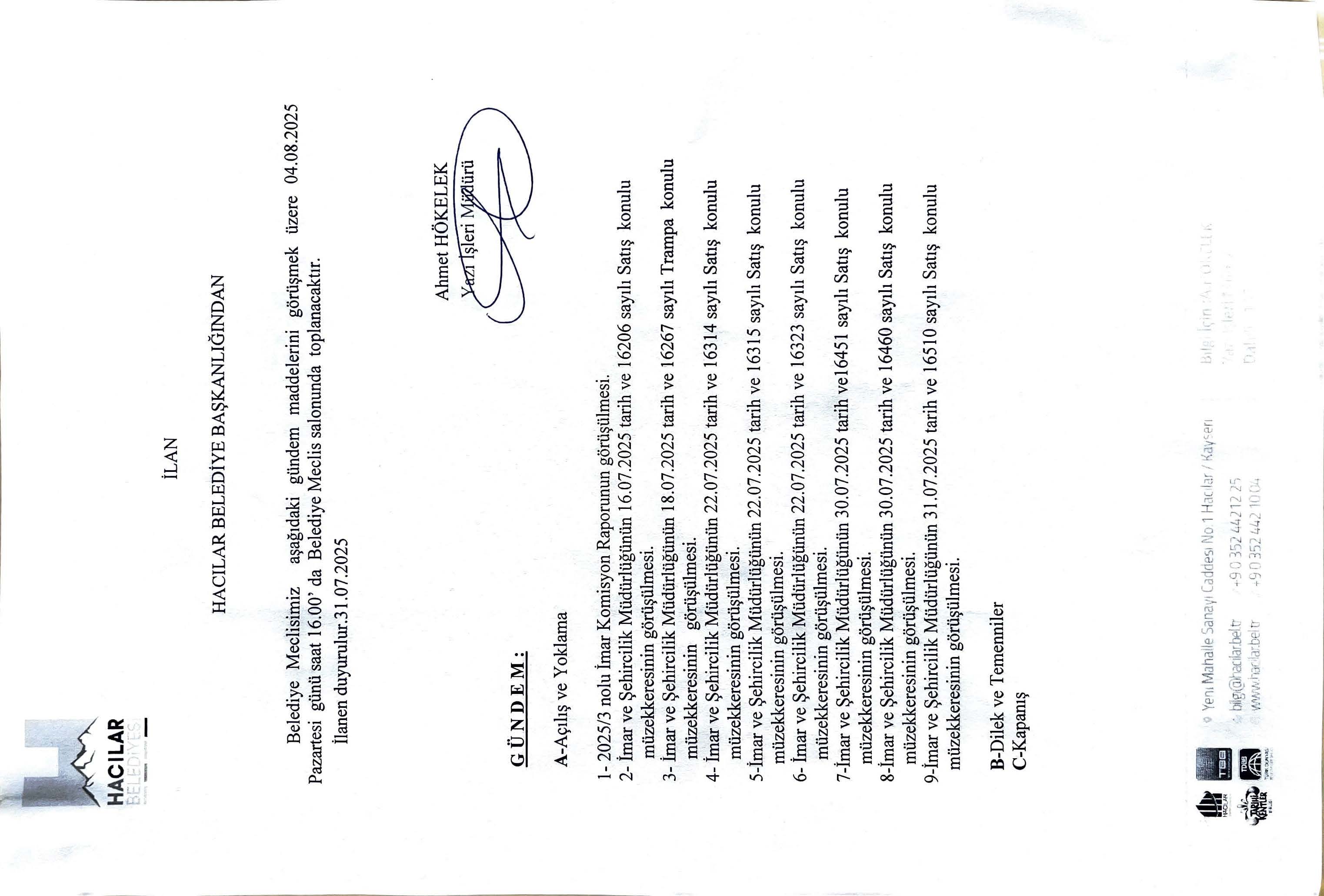 HACILAR BELEDİYE MECLİSİ AĞUSTOS AYI GÜNDEM DUYURUSU