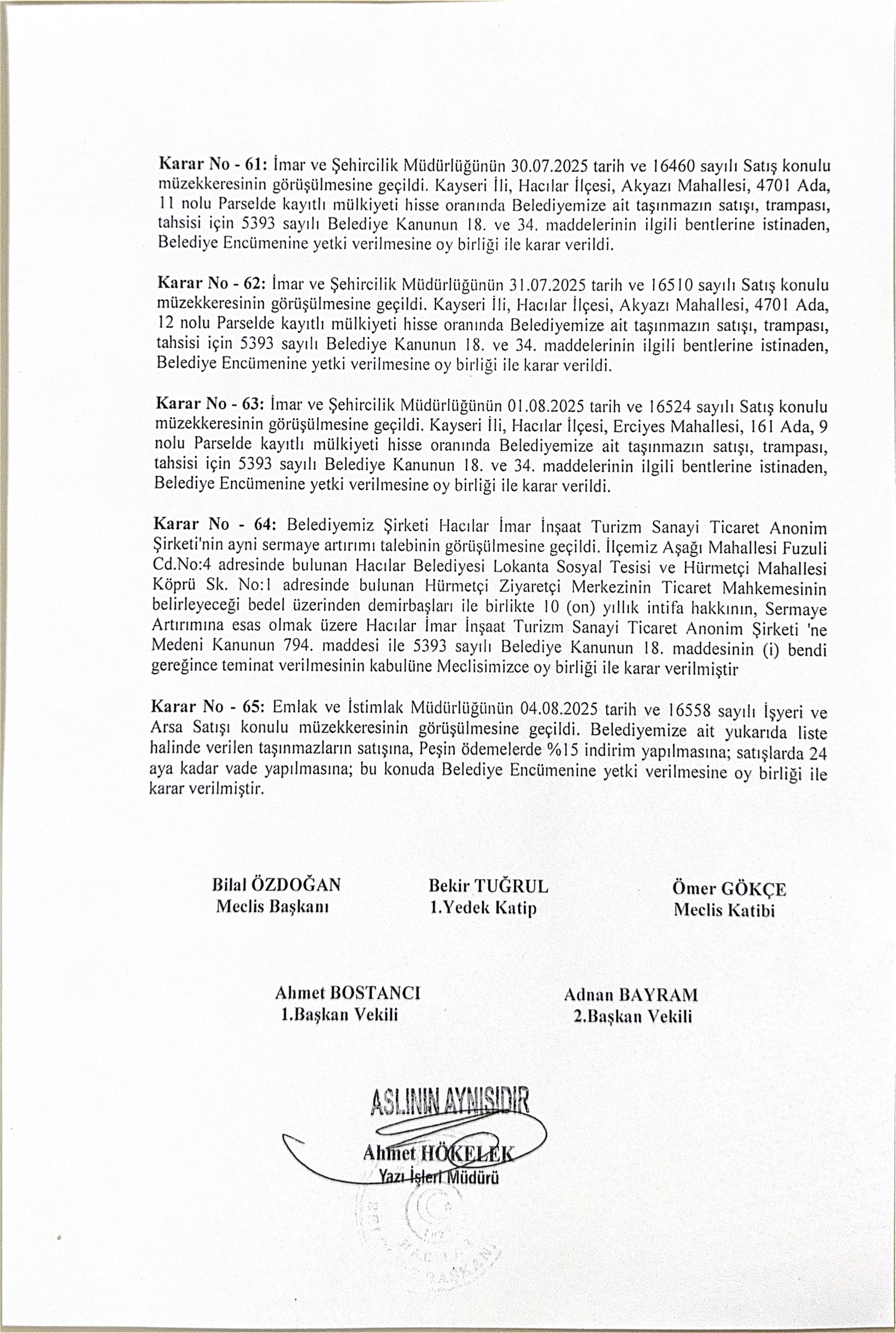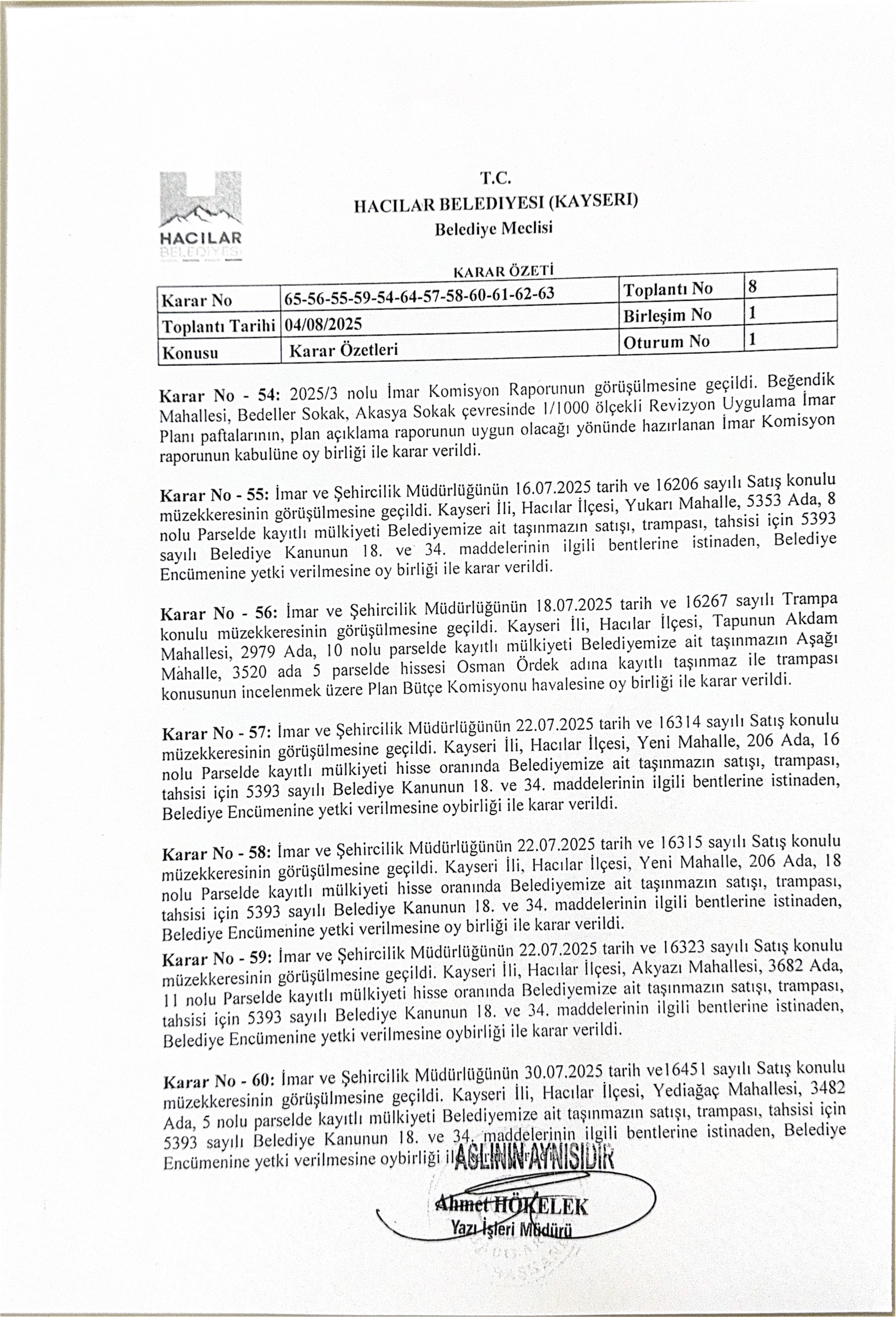 HACILAR BELEDİYE MECLİSİ AĞUSTOS AYI KARAR ÖZETİ