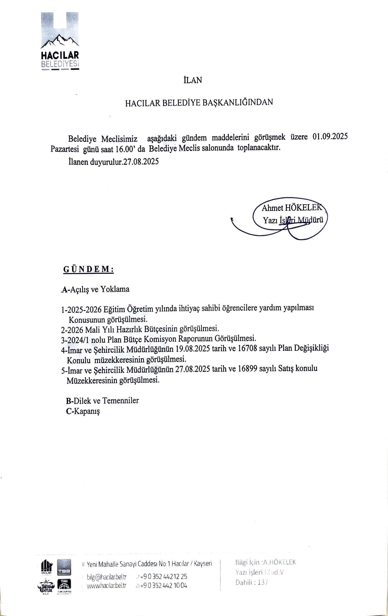 HACILAR BELEDİYE MECLİSİ EYLÜL AYI GÜNDEM DUYURUSU