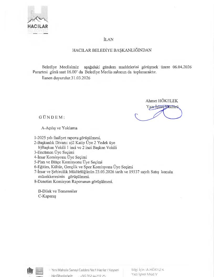 HACILAR BELEDİYE MECLİSİ NİSAN AYI GÜNDEM DUYURUSU
