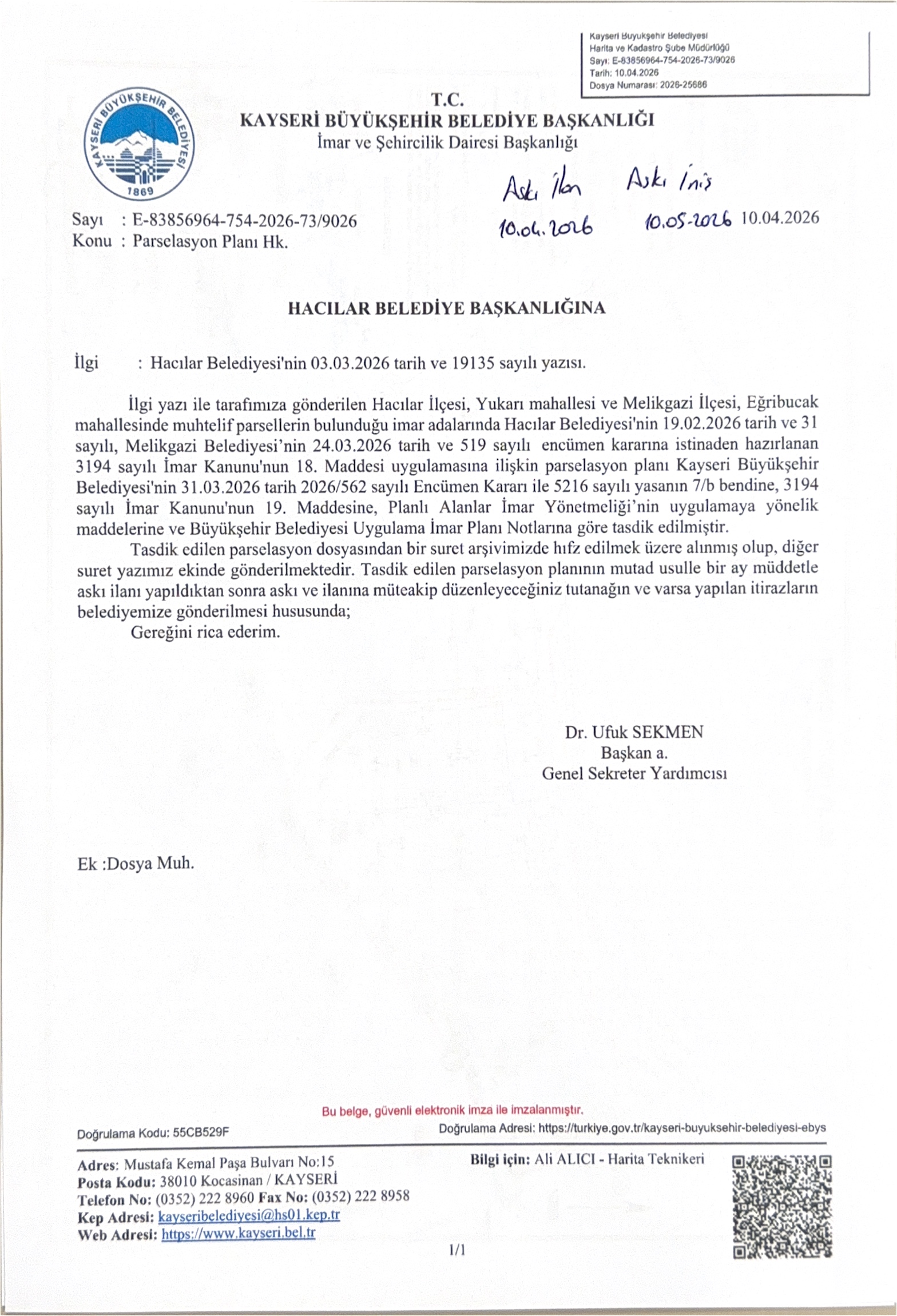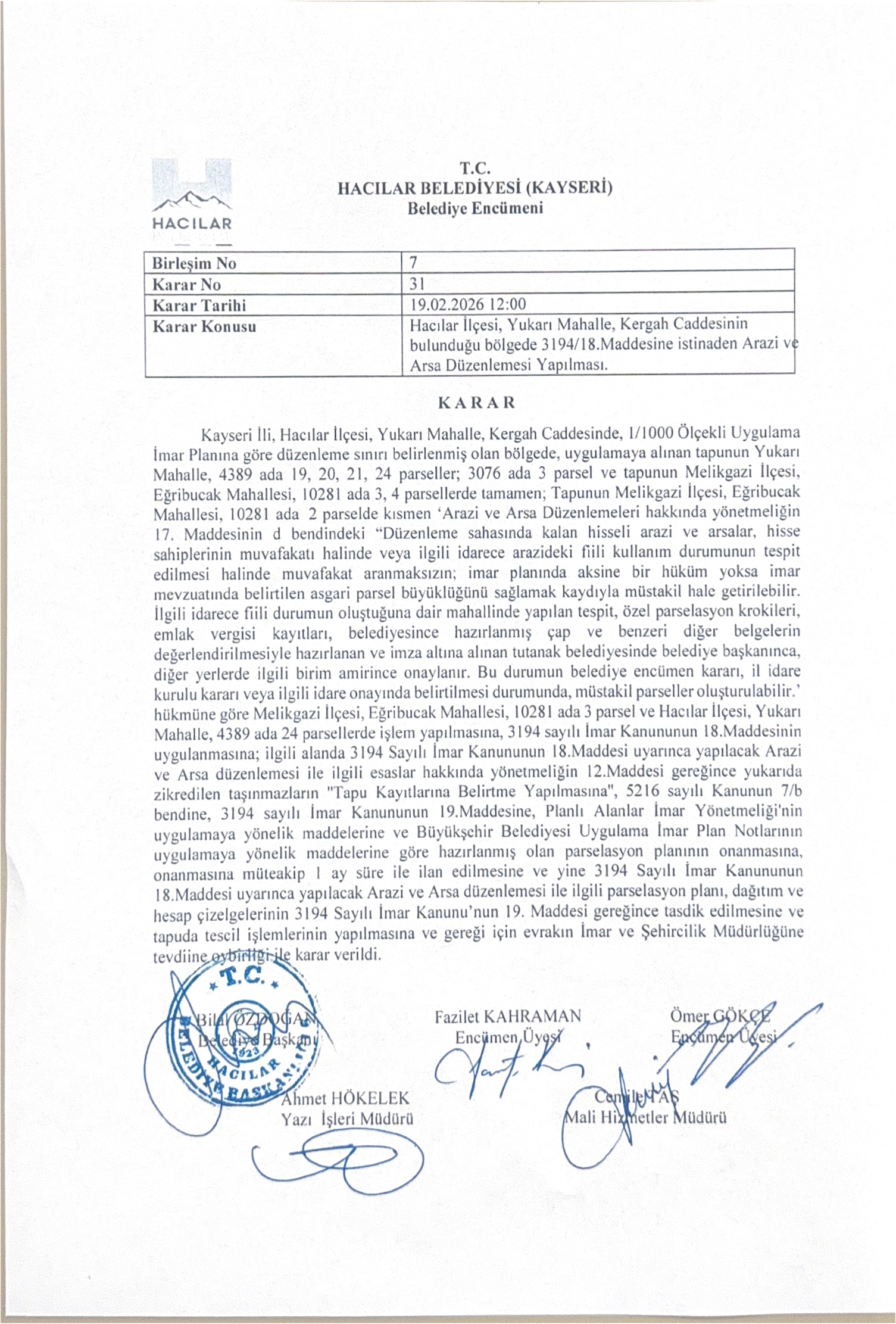 İlçemiz Yukarı Mahalle ve Melikgazi İlçesi Eğribucak Mahallesi'nde muhtelif taşınmazlarda 3194 sayılı İmar Kanununun 18. Madde uygulaması Hakkında Duyuru