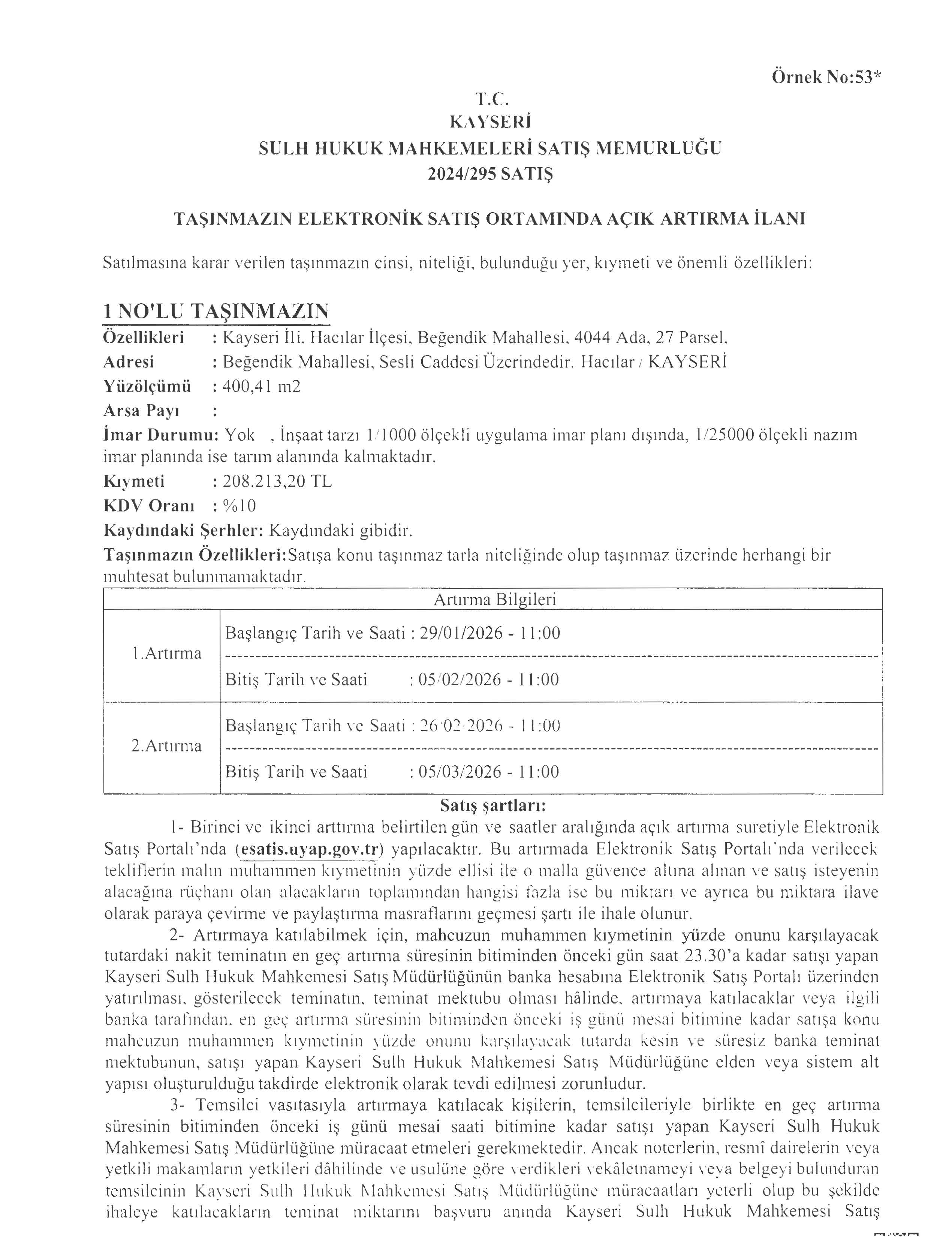 TAŞINMAZIN ELEKTRONİK SATIŞ ORTAMINDA AÇIK ARTIRMA İLANI 05.03.2026