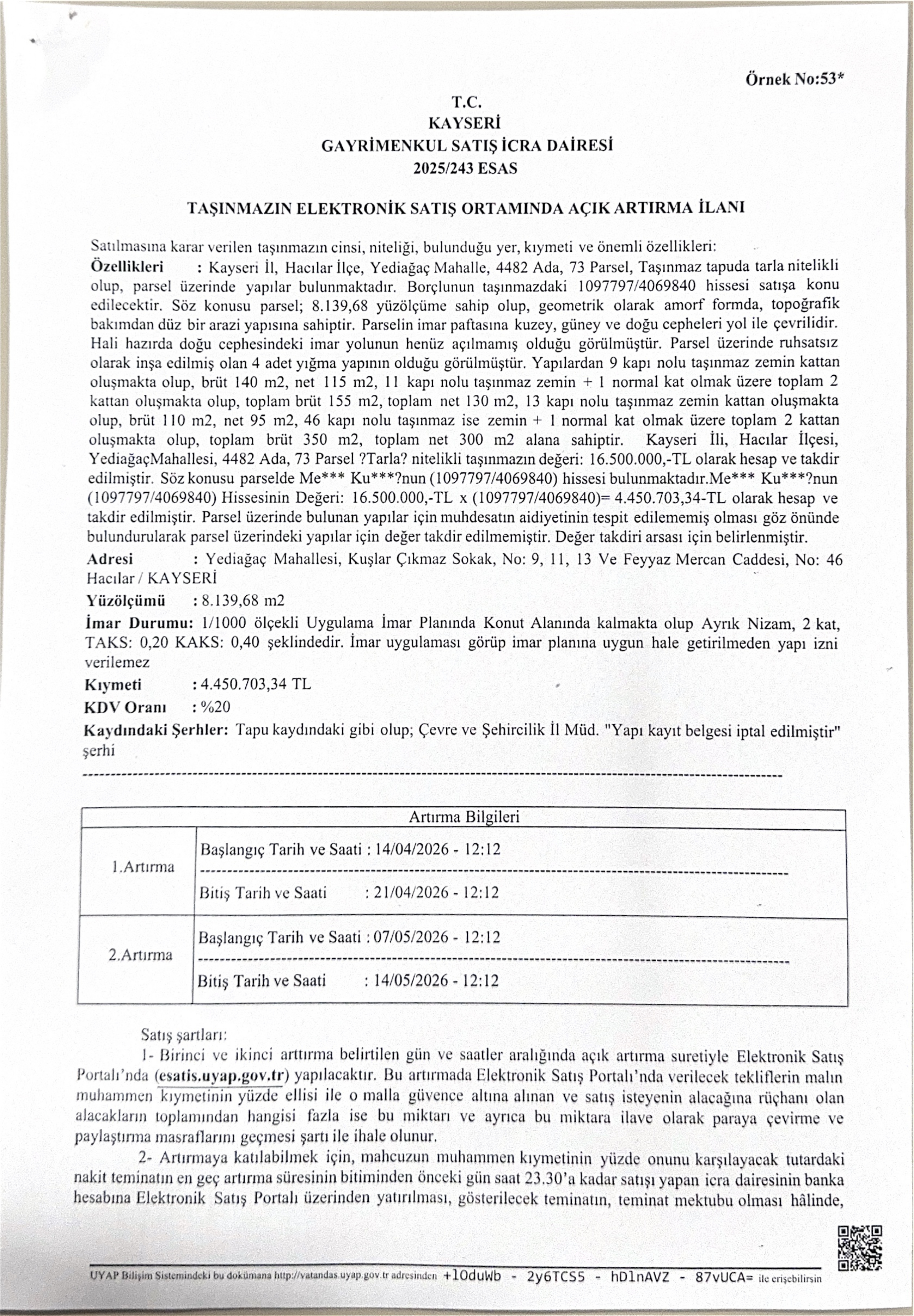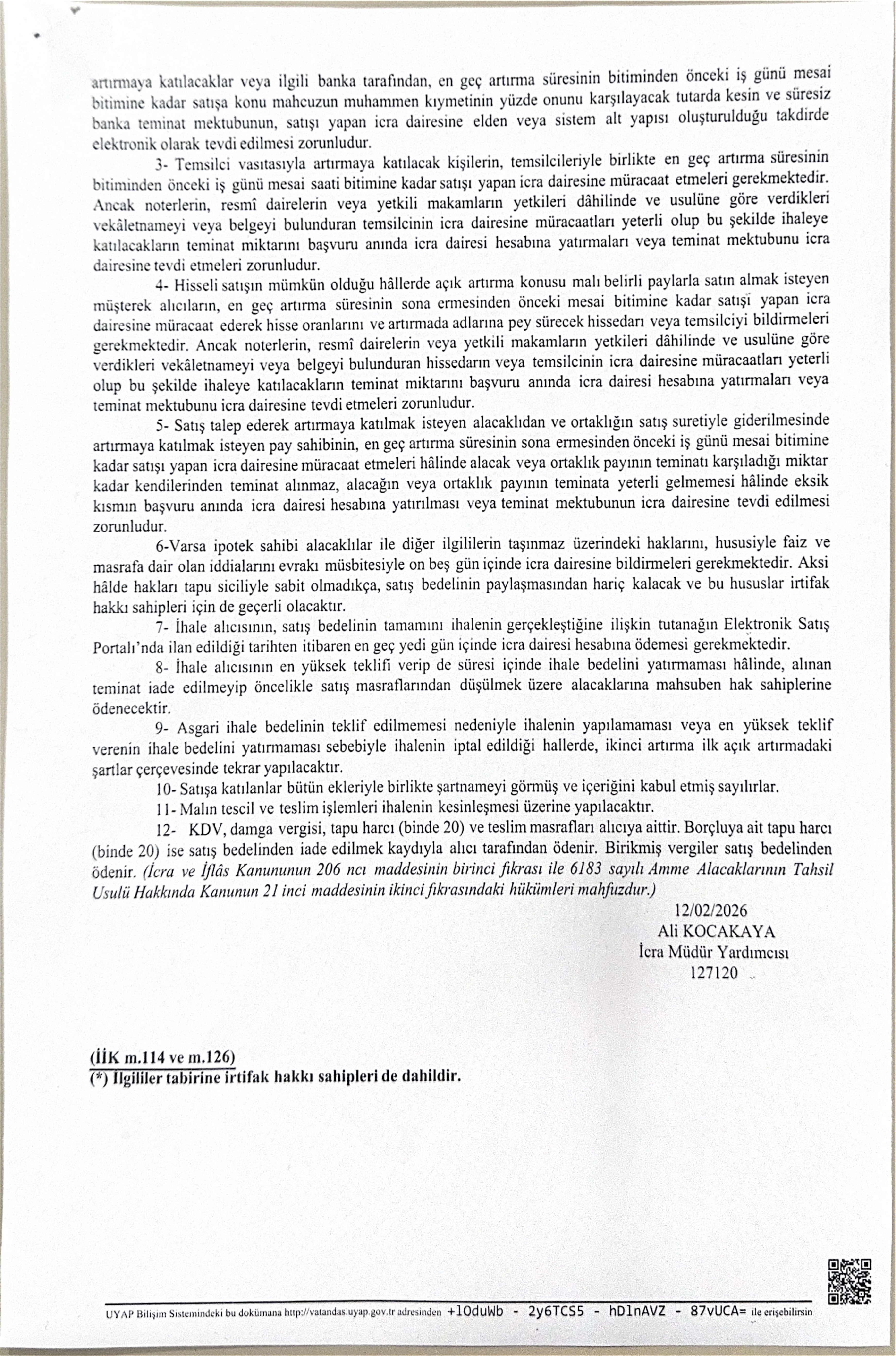TAŞINMAZIN ELEKTRONİK SATIŞ ORTAMINDA AÇIK ARTIRMA İLANI 12.02.2026