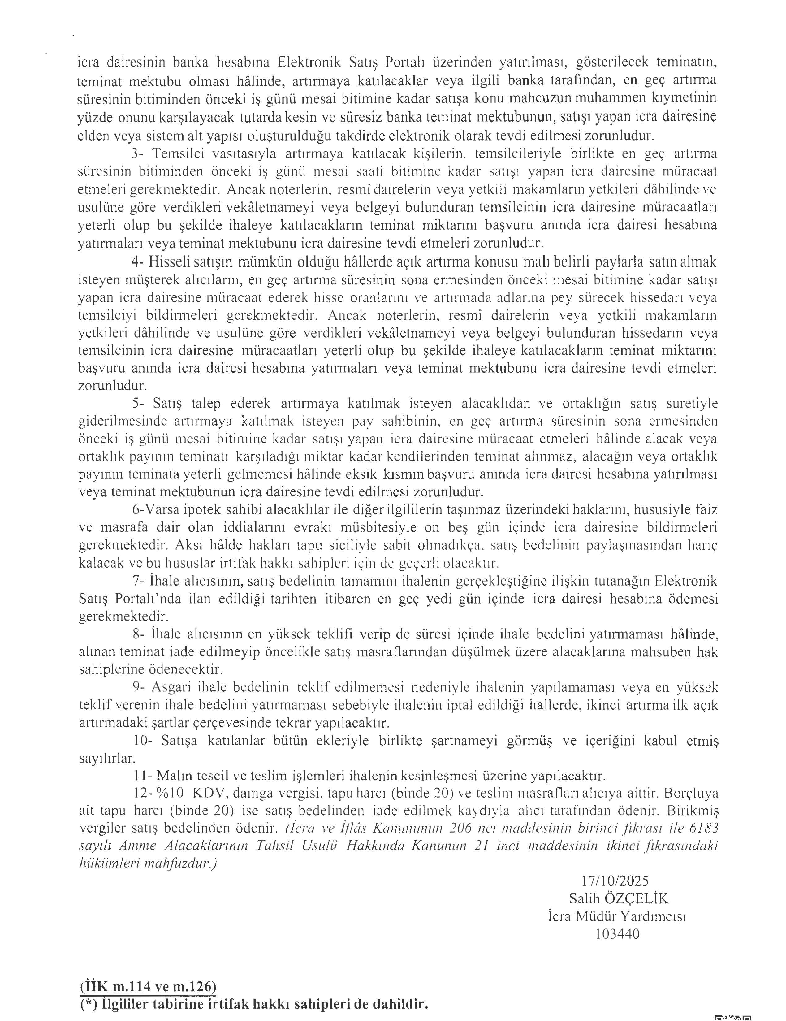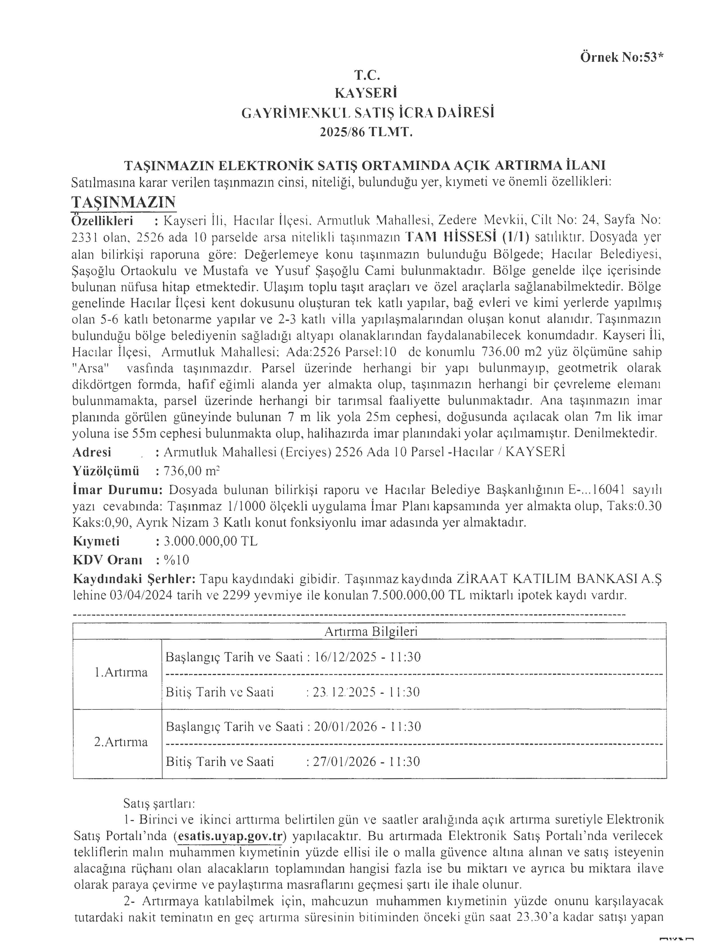 TAŞINMAZIN ELEKTRONİK SATIŞ ORTAMINDA AÇIK ARTIRMA İLANI 27.01.2026