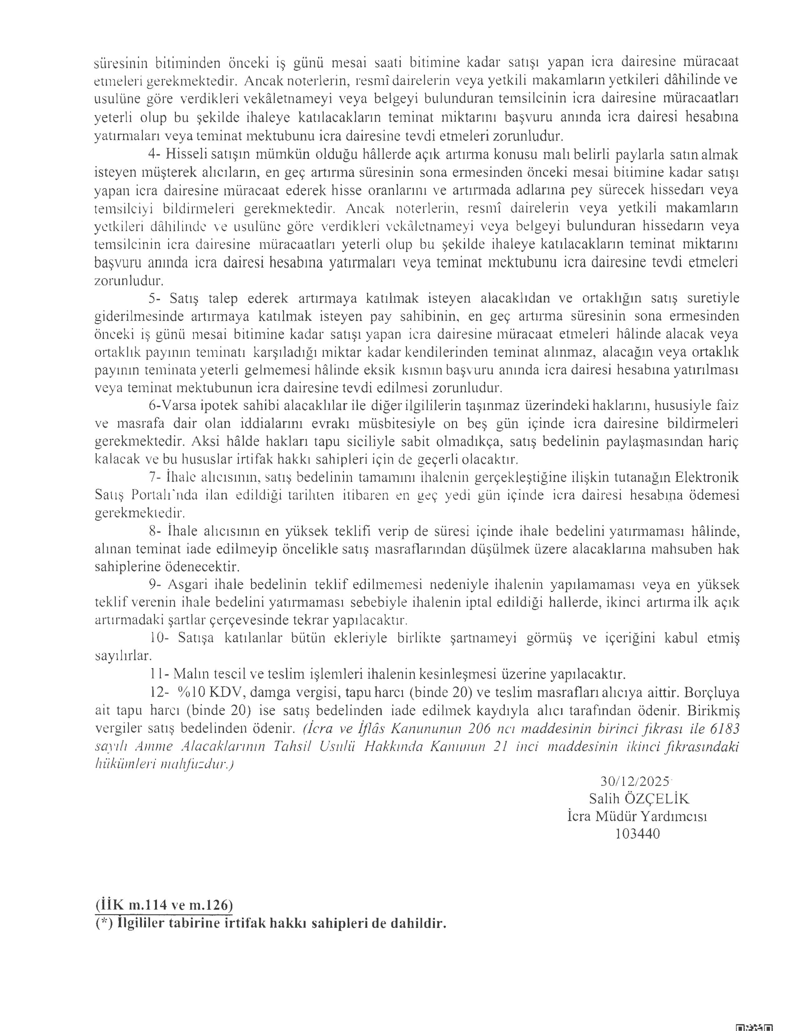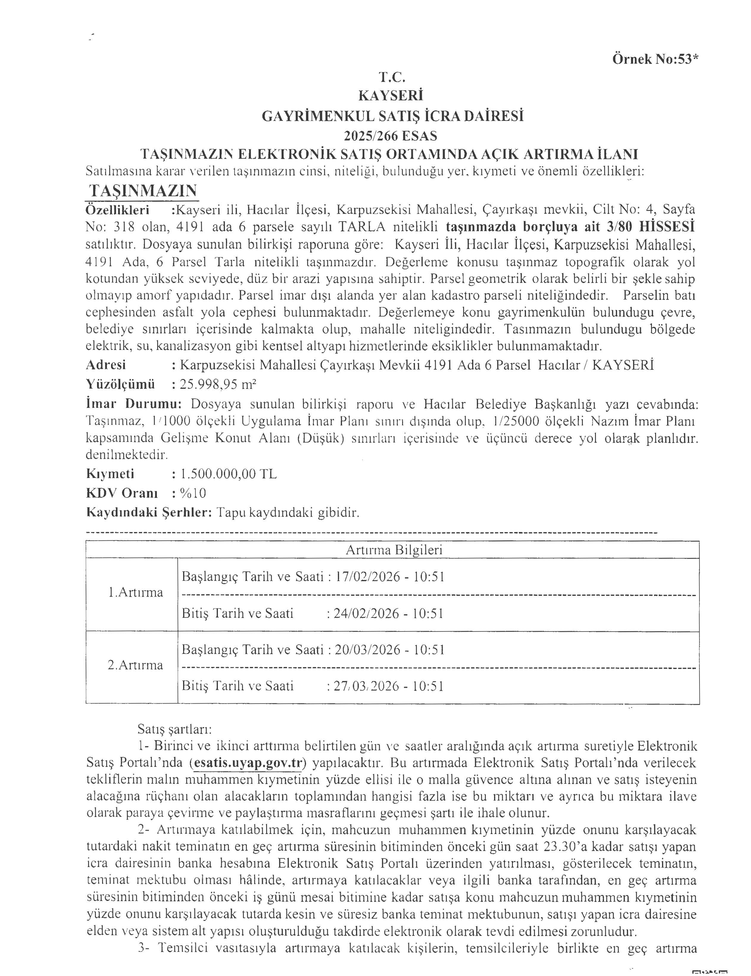 TAŞINMAZIN ELEKTRONİK SATIŞ ORTAMINDA AÇIK ARTIRMA İLANI 27.03.2026