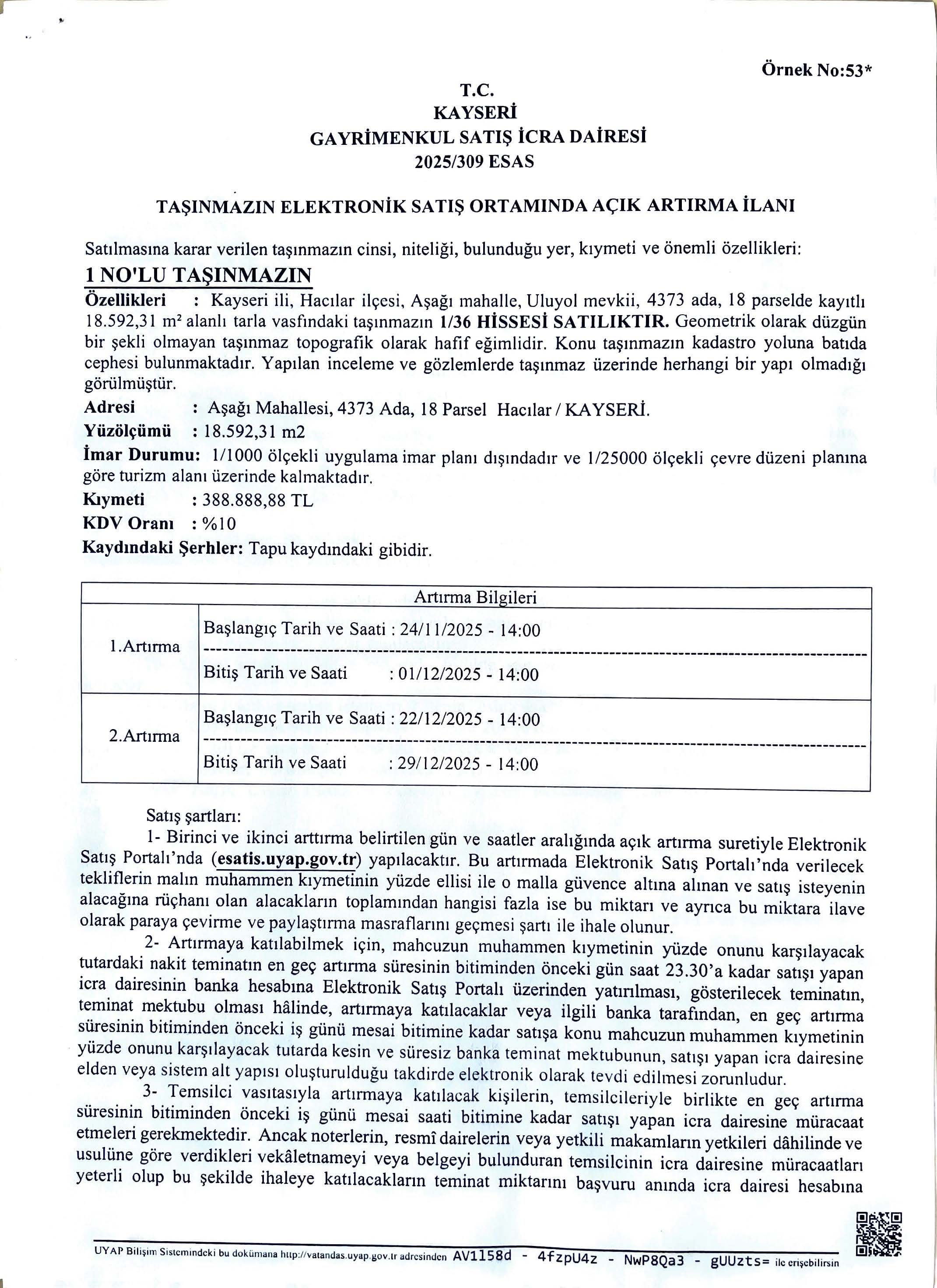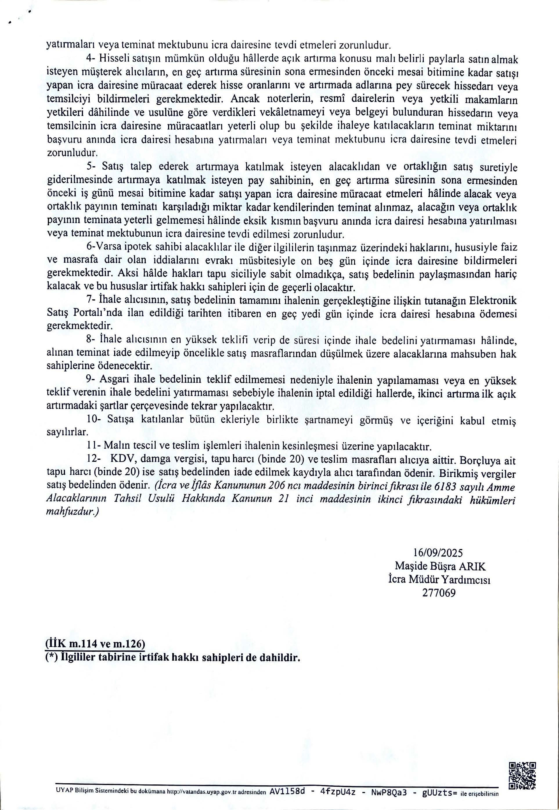 TAŞINMAZIN ELEKTRONİK SATIŞ ORTAMINDA AÇIK ARTIRMA İLANI 29.12.2025